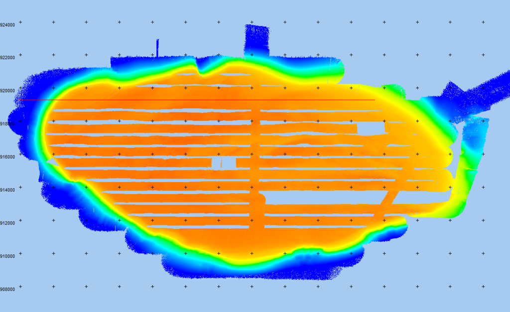 Dans notre cas, nous effectuerons plusieurs passages pour compléter la carte ci-dessous. La partie sud est totalement couverte, alors qu’au centre, un nouveau passage entre les profils existants est nécessaire.